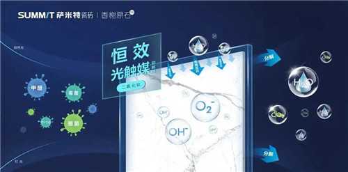 這款瓷磚表面覆蓋著光觸媒功能層在可見光(太陽光,日光燈等)作用下,通過氧化還原反應把有機污染物分解為無污染的水和二氧化碳,實現去除如甲醛,苯等有害物質的功能。