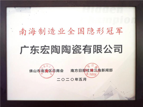 質量、創新、標準、環保,這四大領域的冠軍表現,讓宏陶陶瓷成為佛山南海制造業高質量發展的杰出代表,被授予“南海制造業全國隱形冠軍”榮譽稱號。