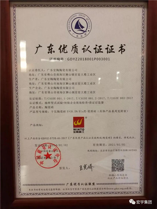 2018年宏陶陶瓷榮獲“廣東優質品牌”認證
