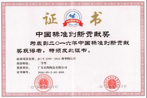 2016年宏陶被國家質監總局、國家標準化管理委員會授予“中國標準創新貢獻獎”