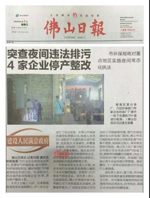 《佛山日報》(2015年8月5日A03版)報道佛山市環保局突查16家企業情況