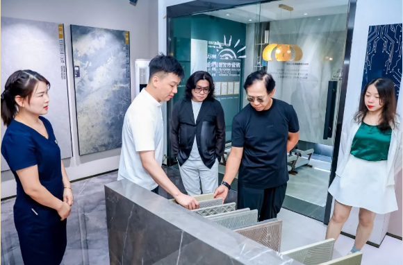 門店走訪的過程中,冠珠華系列巖板——冠珠華脈、華珍、韶華巖板產(chǎn)品視覺效果及靈感故事深深地觸動(dòng)著兩位老師,他們表示:“真正深入骨子里的熱愛,才有了這樣有靈魂的表達(dá)!”同時(shí),冠珠瓷磚多款自然紋理花色的產(chǎn)品也備受青睞,兩位老師紛紛感嘆冠珠產(chǎn)品自然質(zhì)感的出眾。
