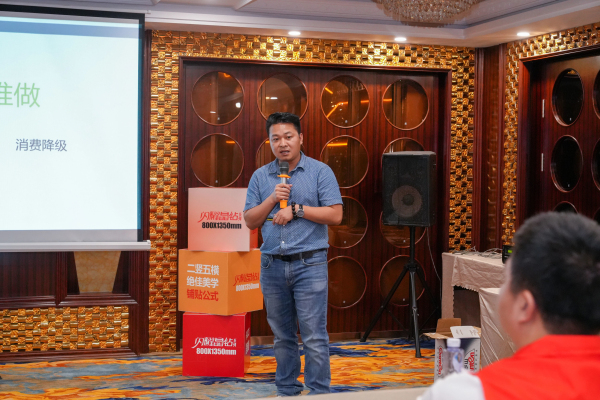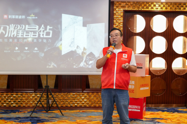 利家居瓷磚營銷總經(jīng)理陳東榮登臺致辭。他鄭重代表利家居瓷磚,向踴躍參與潮南區(qū)域交流會的經(jīng)銷商們致以誠摯謝意。隨后,他清晰闡述了此次潮南交流會的核心目的,期望在座的各位經(jīng)銷商能夠打破固有思維局限,以專注認真的態(tài)度學習,深入剖析優(yōu)秀門店的成功經(jīng)驗,用心汲取運營經(jīng)驗及產(chǎn)品知識表達,并切實做到將所學知識靈活運用到實際經(jīng)營中。