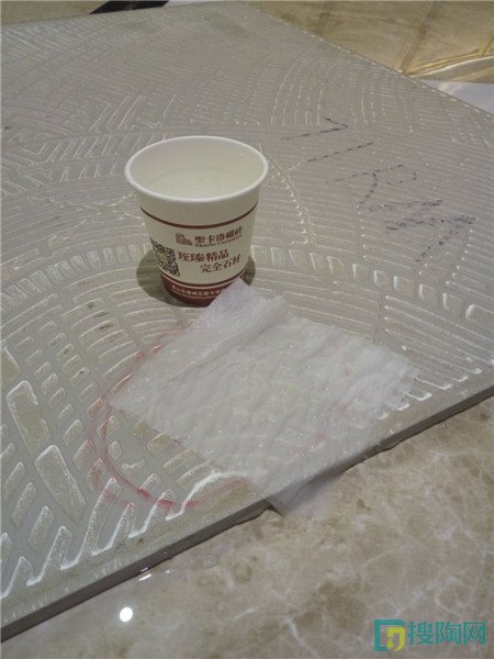 吸水率是檢測瓷磚質量的一個重要標準,一款不易吸水的瓷磚會更加防潮以及可以防止瓷磚的脫落。小編在瓷磚的胚體倒入水,觀察幾分鐘,發現水并沒有向圈外擴散的現象,稍等一會再放了張紙巾,此時圈內的水立即被紙巾洗掉,實驗證明,這款柔光大理石吸水率低,是一款不易吸水的陶瓷