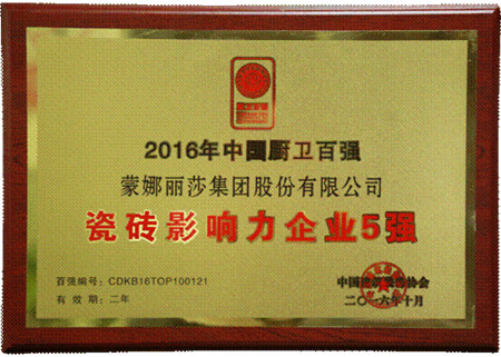 2016年10月27日,以“升級突破•持質以恒”為主題的中國建筑裝飾協會廚衛工程委員會年會暨廚衛應用發展論壇在廣東中山隆重召開。與此同時,第八屆“中國廚衛百強”頒獎典禮也盛裝揭幕。當晚,蒙娜麗莎集團憑借雄厚的品牌實力與顯著的企業成就,榮獲“瓷磚影響力企業5強”。