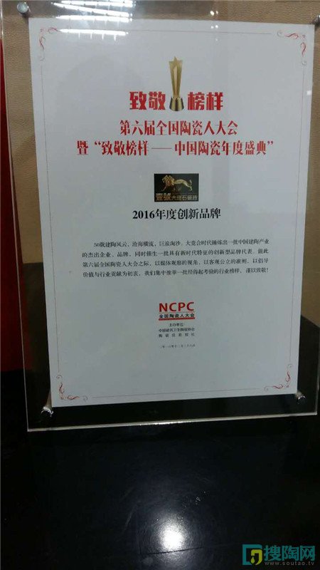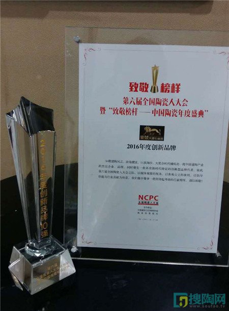 12月28日,由中國(guó)建筑衛(wèi)生陶瓷協(xié)會(huì)主辦的“第六屆(2016)全國(guó)陶瓷人大會(huì)暨‘致敬榜樣’中國(guó)陶瓷年度頒獎(jiǎng)盛典”在佛山完美落幕。大會(huì)就行業(yè)現(xiàn)狀及未來(lái)發(fā)展方向進(jìn)行探討,隨后為一批實(shí)力較強(qiáng)的品牌和企業(yè)進(jìn)行了頒獎(jiǎng)。壹號(hào)大理石瓷磚憑借較強(qiáng)的品牌實(shí)力,以及在終端和總部營(yíng)銷方面的創(chuàng)新,獲得大眾和評(píng)審組的認(rèn)可,榮膺“2016年度創(chuàng)新品牌”大獎(jiǎng)。