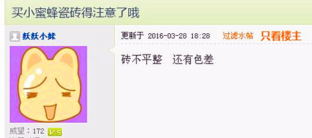 而據小編了解到,小蜜蜂瓷磚之前也出現了過類似問題,在一某知名貼吧上,有網友在貼吧直指其瓷磚質量有問題。