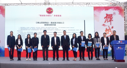 而后,由禪城陶協(xié)特別組織十家代表性陶瓷企業(yè)代表人員上臺開展了“我誠信你放心”誠信承諾宣言儀式。他們分別是:廣東東鵬控股股份有限公司、廣東金意陶陶瓷集團(tuán)有限公司、廣東順成陶瓷集團(tuán)有限公司、廣東博德精工建材有限公司、廣東強(qiáng)輝陶瓷有限公司、肇慶市將軍陶瓷有限公司、廣東樂華智能衛(wèi)浴有限公司、佛山市簡一陶瓷有限公司、佛山市通利陶瓷科技有限公司、廣東新中源陶瓷有限公司。企業(yè)代表們結(jié)束誠信承諾宣言后,佛山市工商局副局長謝建華、禪城區(qū)委常委兼常務(wù)副區(qū)長曹洪彬一同上臺與企業(yè)代表們合影。