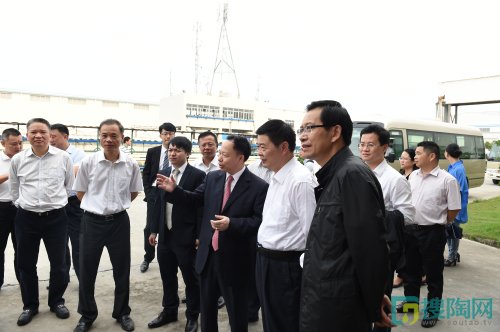 2016年4月13日陽(yáng)江市委書記陳小山(前右2)在廣東博德精工建材有限公司董事長(zhǎng)葉榮恒(前右3)和博德總經(jīng)理助理、公共關(guān)系知識(shí)產(chǎn)權(quán)部總監(jiān)覃空(前右1)陪同下考察博德陽(yáng)西生產(chǎn)基地
