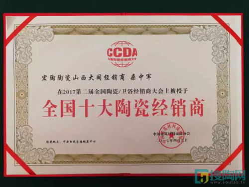 宏陶陶瓷山西大同經銷商桑中軍具有25年的陶瓷經營經驗,性格正直、大方,是一個原則性很強,實事求是、充滿正能量的人。決定了的事情馬上會去做,而不會等到明天。在2017年4月在行業兩會上,更獲得“全國十大陶瓷經銷商”稱號。