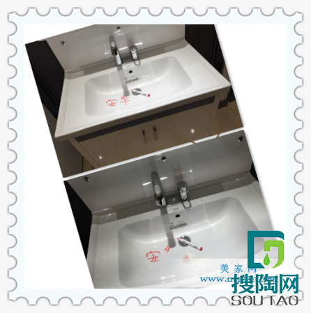 陶瓷柜盆表面的智潔釉層硬度高耐摩擦、密度大、表面結構整密,污物不易附在表面,使潔具更易清潔,更衛生。小編用用油性筆涂畫在陶瓷柜盆表面上測試耐污性,用沾了水的紙巾能輕松擦拭干凈。