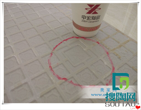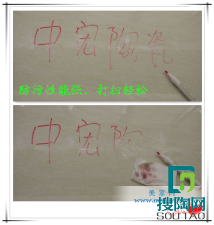一般的瓷磚表面有細微氣孔,容易被污物入侵,成為污垢溫床。所以測量瓷磚的抗污性能很重要。隨之,小編在瓷磚表面上寫有“中宏陶瓷”幾個字,隔了10分鐘時間后用干紙巾輕輕抹掉,字跡很快變消失了,看來中宏陶瓷這款阿爾卑斯系列產品防污性能很不錯。
