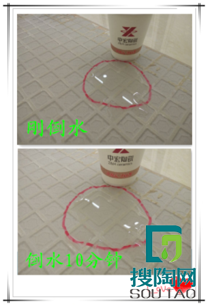 吸水率也是決定了瓷磚使用壽命的因素之一,瓷磚的吸水率能直接說明產品的密度和影響產品的耐臟度。在瓷磚正面與背面倒上少量水,觀察瓷磚吸水情況。細心的評測員發現,10分鐘過去了,水珠依然保持原形(圖一)。用紙巾輕輕一擦,水就輕易被吸干了(圖二)。可見中宏陶瓷阿爾卑斯HPA8011瓷磚不僅密度好,防水功能更不容置疑,回南天媽媽再也不用擔驚受怕了。