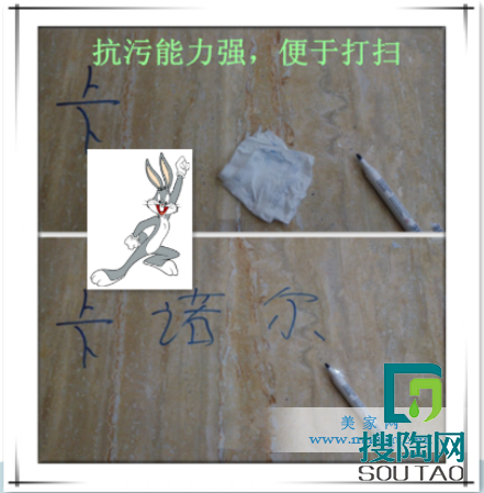 一般的瓷磚表面有細微氣孔,容易被污物入侵,成為污垢溫床。所以測量瓷磚的抗污性能很重要。測評員在卡諾爾“晶拋大理石Ⅱ代”瓷磚表面上寫上“卡諾爾”三字,隔一段時間后用濕紙巾輕輕抹掉,字跡很快擦得無影無蹤了,可見防污性能優越。