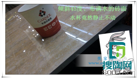 光滑的瓷磚帶來晶亮的視覺效果,但是卻有著一定的滑倒隱患。真正好的瓷磚,必能貼心照顧您生活的每一處細節。為此,小編選擇把杯子放在傾斜45度灑滿水上的瓷磚上來測試,發現杯子居然沒有滑動的現象。可見,這款卡諾爾“晶拋大理石Ⅱ代”的防滑性消費者大可放心。