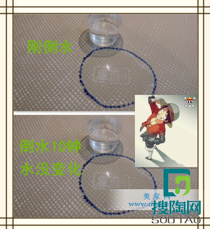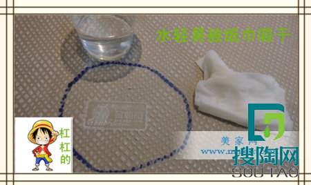 吸水率也是決定了瓷磚使用壽命的因素之一,瓷磚的吸水率能直接說明產品的密度和影響產品的耐臟度。在瓷磚正面與背面倒上少許水,觀察瓷磚吸水情況。細心的小編發現,10分鐘過去了,水珠依然保持原形。