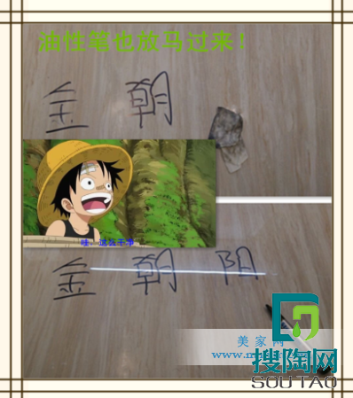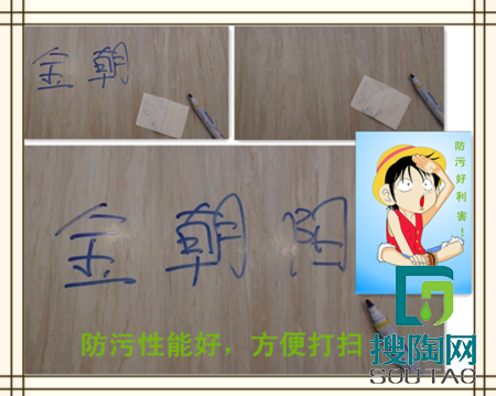 一般的瓷磚表面有細微氣孔,容易被污物入侵,成為污垢溫床。所以測量瓷磚的抗污性能很重要。小編分別用水性筆和油性筆在瓷磚表面上寫上“金朝陽”三字,隔一段時間后用濕紙巾輕輕抹掉,發現不管是水性還是油性字跡都很快變消失了。