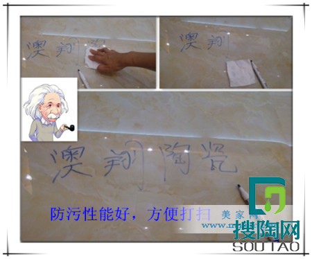 澳翔超平釉“云微晶”系列產品瓷磚在現代技術的保障下,摒棄了天然石材和普通瓷磚難清潔的難題。小編用油性記號筆在瓷磚面上寫上“澳翔陶瓷”四字,發現這款磚表面非常光滑,油性筆的字跡寫上后看不出有滲透的痕跡。幾分鐘后用濕紙巾輕輕擦拭,即可輕松擦掉筆跡,且無磨痕,可見,瓷磚表面光可鑒人,亮潔如新。并且小編發現擦過的地方用記號筆就很難再寫上字,這也從一個側面表現出澳翔超平釉“云微晶”優越的耐污性。