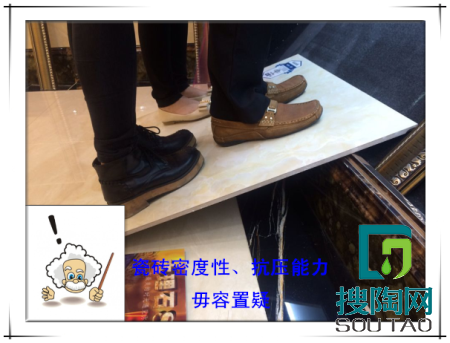 密度性與瓷磚的耐用性成正比,同一規格產品,質量好,密度高的磚手感都是比較沉的,反之,次品手感較輕。小編拿起澳翔超平釉“云微晶”系列產品瓷磚時雙手都略顯吃力,可見瓷磚“真材實料”,我們小編和簡一兩個工作人員站在傾斜45角度的云微晶瓷磚上,瓷磚沒有發生任何細微的改變,也足以說明這款瓷磚的致密性是非常不錯的。
