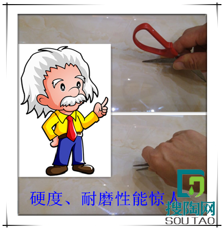 小編手拿剪刀,我劃,我劃,我劃、劃、劃!看我的手指,剪刀都被我暴力的劃分開成一字馬了,呵呵!結果是幾乎劃了一分鐘左右,手都麻木了。 巡視結果,磚面上居然沒有一點劃過的痕跡和粉末,這另類瓷磚真是夠硬。這下小編不禁不對它刮目相看!