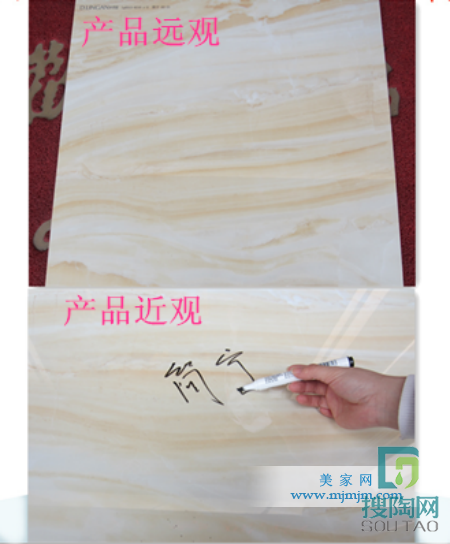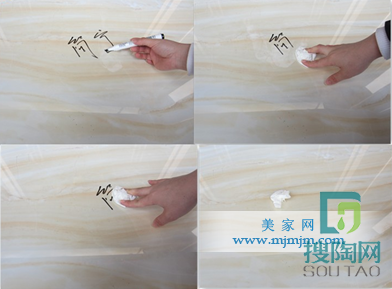 油性筆一般是比較難清除的。我們測評人員使用油性筆在瓷磚表面涂寫字樣,等待其慢慢干透,再用紙巾擦拭。發現該款瓷磚上的字跡基本被清除,從中可見這款瓷磚抗污力很好,平時很易打理,是消費者裝修的好選擇。