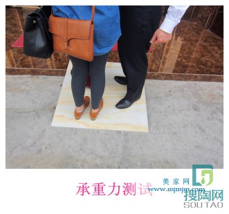 承重力測試--如圖所示,將瓷磚一側墊起一定的角度,三個成年人雙腳站在瓷磚表面,并沒有出現彎曲和斷裂現象,可見這款瓷磚的承重能力確實不錯。