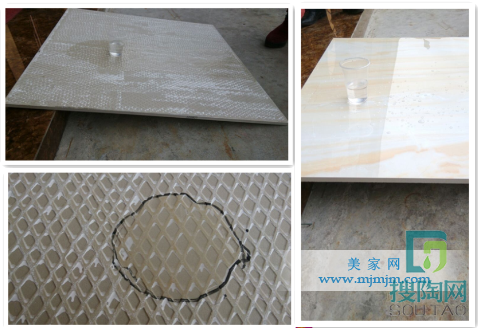 評測人員經過試驗,將水倒入該款瓷磚背面后,瓷磚表面的水珠依舊成型不擴散,無明顯滲透現象。用抹布將水抹去后,經過3分鐘,上面的水漬依舊清晰,吸水速度慢,證明該款瓷磚吸水率較低,質量較好。