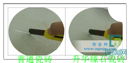 瓷磚是否耐磨關(guān)系到瓷磚的使用壽命,評測專員在現(xiàn)場找來一把銳利的刀子,來回在兩塊瓷磚表面劃割。升華臻石瓷磚表面并沒出現(xiàn)任何痕跡,用手觸摸摩擦區(qū)域,無任何摩擦后殘留凹凸感,結(jié)果證明此款產(chǎn)品并不懼怕利器劃割。平時愛穿高跟鞋的女士放心啦,您的鞋跟不會給這款瓷磚造成影響。相反,普通瓷磚上刮擦,即有刮痕和粉塵出現(xiàn),不利于日常生活和公共空間區(qū)域的使用。