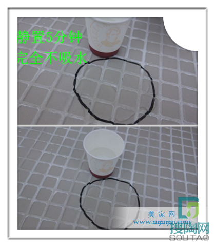 瓷磚的吸水性低能夠延長使用壽命。檢驗(yàn)瓷磚是否滲水,要從瓷磚背面開始測試,更容易發(fā)現(xiàn)問題。評測員在這款瓷磚的背面倒小許的水,靜置20分鐘,發(fā)現(xiàn)瓷磚的表面水珠無任何擴(kuò)散和流失,水滴基本沒有滲透。用濕抹布將水吸干,用手觸摸被水浸過的表面,較干爽。