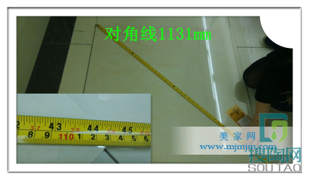 用卷尺測量瓷磚的對角線,來確定瓷磚的規(guī)格十分標(biāo)準(zhǔn),美家網(wǎng)測評專員通過測量,發(fā)現(xiàn)兩條對角線的長度幾乎相等,這樣規(guī)范的尺寸,這樣可以保證完美的鋪裝效果。