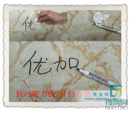 除了防滑性外,消費者也非常關注防污性的問題,因為這會讓不少家庭主婦省下不少力氣。小編用油性筆在產品的表面寫了“優加”兩個字,十分鐘過去后,再用紙巾輕輕擦拭,字很容易就被抹去。在陽光的照耀下,磚的表面并沒有留下任何污跡。因此可見該款產品也是非常好打理的。