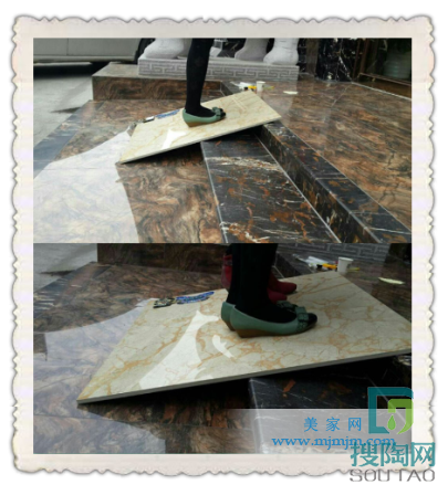 盡管是兩個人接近200斤的重量,都不足以站碎優加“索菲特金系列瓷磚。實驗證明,測評后,產品完好無損,胚體緊實,承重力高。瓷磚的抗壓性主要表現在它能承受家居里擺設的家具的重量。當然,貼在地板上的瓷磚與被架起的瓷磚的抗壓能力有所區別。貼在地板上瓷磚承受的重量會大大大于架起瓷磚所承受的。