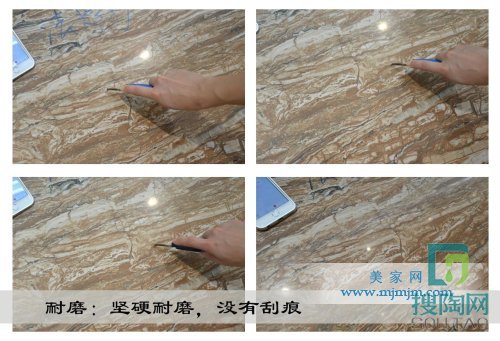 在實際使用中,瓷磚經常會受到摩擦,可能會產生刮痕。小編用劃刀在法恩莎瓷磚臻·海紋玉表面用力劃刮,發(fā)現(xiàn)瓷磚表面沒有任何刮痕,亮麗如新。