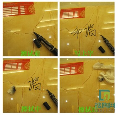 測試員用黑色油性筆在和諧這款瓷片的釉面寫上“和諧”,靜置5分鐘之后,等墨跡干了之后,用紙巾擦拭“和”,很快就清除了表面的污漬,在擦“諧”的時候,測評員特意沾了點水,結果發現,擦拭起來更加快速和干凈。由此可以看出,這款瓷片防污性能非常好,平常居家打理非常方便。