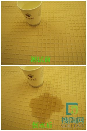 測評員在磚體背面倒上白開水,水迅速滲進磚體,由此可以得出,這款瓷片吸水率很高,用水泥鋪貼上墻也比較容易和方便。