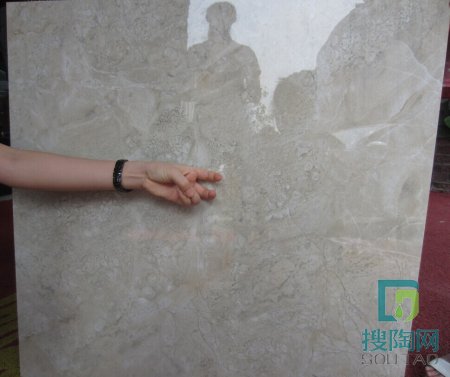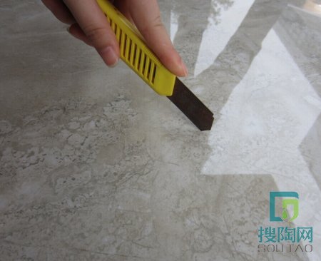 ★點評:測評員用堅硬的工地專用刀試著刮了一下“羅馬灰”釉面,很滑,再來回用力刮,也沒有見到刮痕,用手摸刮處,無明顯變化,由此可見這款磚耐磨度非常強。