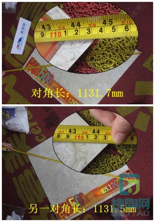 ★點評:根據國家標準,允許的邊長最大尺寸偏差為±0.5%,測評員帶的是卷尺,精確到0.1mm,那么具體的核算值為800㎜×±0.5%=±4㎜,這款產品,實際測量邊長均為800.0㎜,無偏差。對角線標準長度為800㎜*根號2=1131.37㎜,實際測量長度為1131.7mm和1131.5mm,符合國家標準。可見,“羅馬灰”的規整度相當高,規格精確。