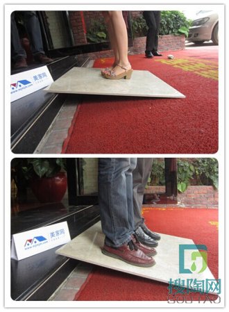 ★點評:想判斷瓷磚是否耐用,其抗壓性也是不可忽視的重點。將該款瓷磚鏤空斜架放置在129mm高處,測評員穿著坡跟涼鞋站上去,穩穩當當,來回走動,瓷磚沒有出現打滑的跡象。接著,尚豪美家兩名工作人員(共約280斤重)一起站在斜靠的瓷磚上面,沒有出現顫動和瓷磚開裂的現象。說明“羅馬灰”的結構十分致密,強度和硬度都很大,承載能力和防滑能力都不錯。