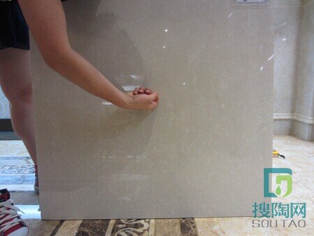 測評人員把瓷磚鏤空放置于20cm的邊上,由美家網測評員先站在瓷磚中央,沒有出現顫動現象,接著再讓金牌亞洲工作員人員站在瓷磚中央,瓷磚也沒有明顯開裂的現象。證明“白玉蘭”抗壓承重性不錯。