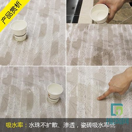 國家標準規定瓷磚為E≤0.5%的吸水率,陶質磚吸水率E>10% 。實際效果是將一杯150毫升的水倒在瓷磚背后,在3秒鐘后,如果水會全部滲入磚體,則說明瓷磚的吸水速度較快吸水率E>10%,那么也就說明瓷磚質量較差。評測員經過試驗,將水倒入該款瓷磚背面后,瓷磚表面的水珠依舊成型不擴散,無明顯滲透現象;用抹布將水抹去后,經過3分鐘,上面的水漬依舊清晰,吸水速度慢,證明該款瓷磚吸水率較低,質量較好。
