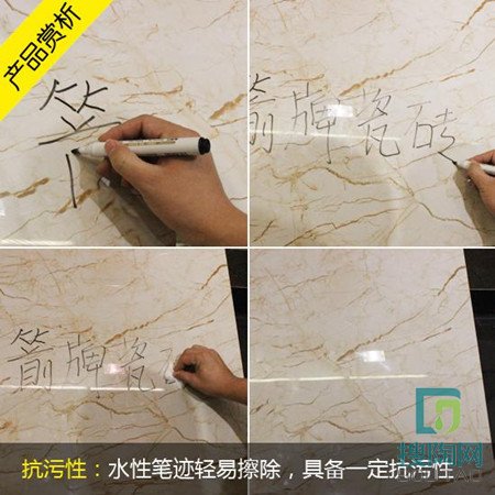 一般的拋光磚表面有細微氣孔,容易被污物入侵,成為污垢溫床。所以測量拋光磚的抗污性能很重要。測評員用水性筆在表面寫字----筆跡干后再用毛巾擦拭——表面干凈,無殘留——抗污性能不錯。