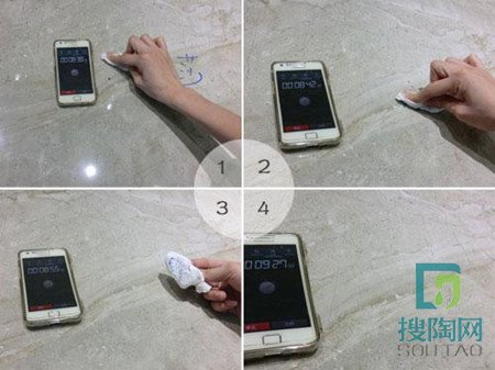 2分鐘后筆跡干透,為了使得評測更具說服力,小編特意等到8分多鐘的時候才開始擦拭污漬,由以上步驟圖可知,威尼時光瓷磚FCS80626P由于表面光潔瑩華,污漬很容易就擦拭掉了,而且不留任何痕跡。使用這款瓷磚的朋友們不用為清潔問題而擔心咯!