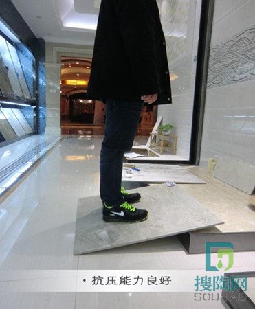 為了測試威尼時光瓷磚的抗壓性,我們特意請現場最具“重量級”的同事上陣,將瓷磚傾斜中空放置在臺階上,整個人踩上去,來回走動,瓷磚未見裂痕和破損。由此可知威尼時光瓷磚可承受重壓,抗壓性不錯。