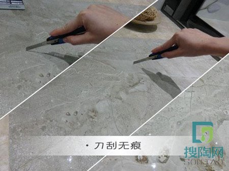 小編用尖銳的美工刀在瓷磚表面劃過,來回劃刮好幾次,瓷磚表面光滑平整如新,未見任何刮痕。說明瓷磚的耐磨性良好。