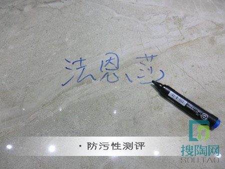 小編用藍色彩筆在威尼時光瓷磚表面書寫“法恩莎”字樣,以此測評該款瓷磚的防污性能。