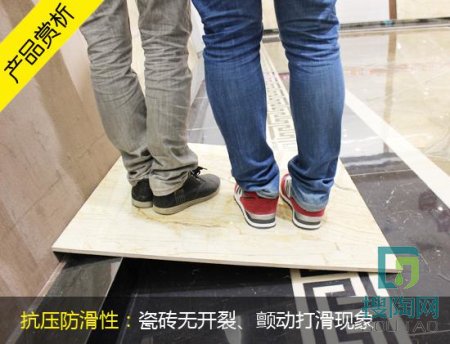 想判斷瓷磚是否耐用,其抗壓性也是不可忽視的重點。將該款瓷磚鏤空斜架放置,評測員和一名工作人員一起站在斜靠的瓷磚上面,瓷磚能承受兩個人的重量,沒有出現(xiàn)顫動和瓷磚開裂的現(xiàn)象。同時,評測員在瓷磚斜面上來回走動時,瓷磚沒有出現(xiàn)打滑的跡象。說明磚片結(jié)構(gòu)十分致密,強度和硬度都大,承載能力和防滑能力都不錯。