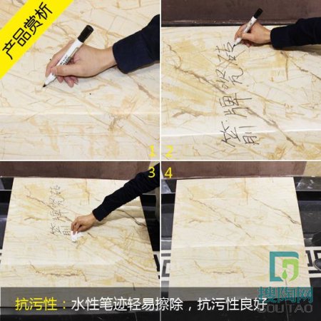 一般來說,優(yōu)質(zhì)的抗污性能優(yōu)良,多種污穢漿泥、染色溶液不易侵入滲透,依附于表面的瓷磚污物也很容易清除擦凈,特別方便于建筑物的瓷磚清潔維護。為了印證這一點, 評測人員用水性筆在表面寫字,筆跡干后再用毛巾擦拭,表面干凈無殘留。可以看出,這款瓷磚的耐污性優(yōu)良,在生活中可以不必為清潔問題煩惱了。