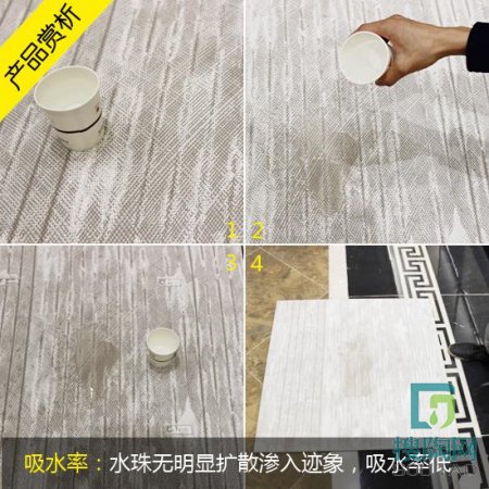 國家標準規(guī)定瓷磚為≤0.5%的吸水率,實際效果是將一杯約150毫升的水倒在瓷磚背后,水基本不會滲入磚體。評測員經(jīng)過試驗,將水倒入該款瓷磚背面后,瓷磚表面的水珠依舊成型不擴散,無明顯滲透現(xiàn)象,瓷磚吸水率低。