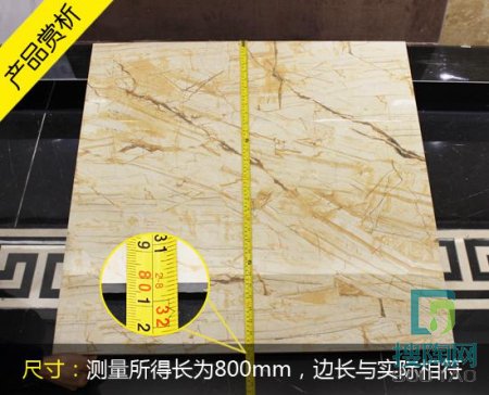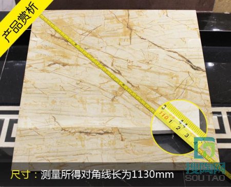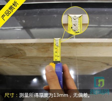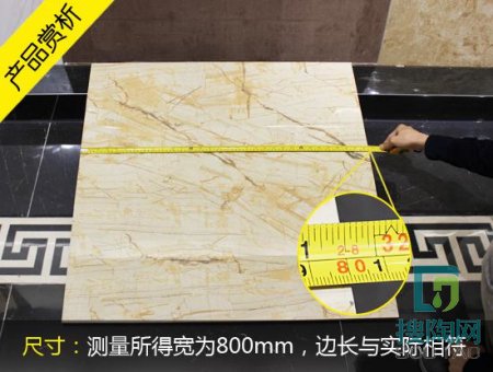 根據(jù)國家標準,允許的邊長最大尺寸偏差為±0.5%,那么具體的核算值為800㎜×±0.5%=±4㎜,這款瓷磚實際測量邊長均為800㎜,無偏差。對角線標準長度為1131.37㎜,實際測量長度為1130.00㎜,無偏差,符合國家標準。國家規(guī)定的瓷磚厚度的標準偏差為±5%,這款瓷磚標準厚度為13㎜,無偏差。可見,該款瓷磚規(guī)整度相當高,規(guī)格精確。