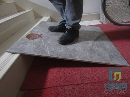 【美家小編點評】接著,工作人員和小編同時站上去,瓷磚還是穩穩當當的。“云朵拉灰”的承重性也非常好,如圖所示(ps:工作人員體重130斤,我體重100斤)